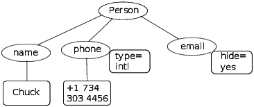 Often it is helpful to think of an XML document as a tree structure where there is a top tag person and other tags such as phone are drawn as children of their parent nodes.
