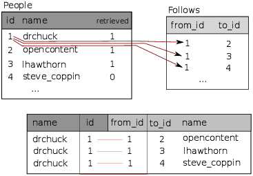 You can see the id, name, and visited fields in the People table and you see the numbers of both ends of the relationship in the Follows table. In the People table, we can see that the first three people have been visited and their data has been retrieved. The data in the Follows table indicates that drchuck (user 1) is a friend to all of the people shown in the first five rows. This makes sense because the first data we retrieved and stored was the Twitter friends of drchuck. If you were to print more rows from the Follows table, you would see the friends of users 2 and 3 as well.